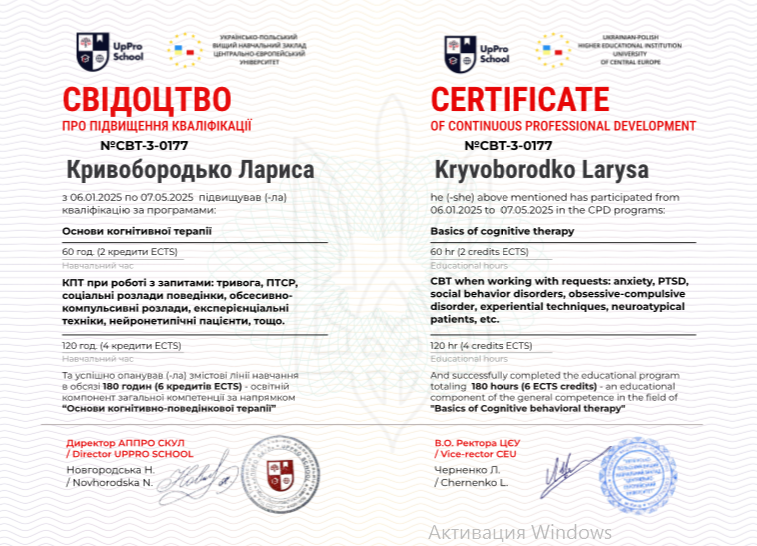 Ефективно працюю над панічними атаками, тривожно-депресивними розладами, фобіями, страхами, депресіями, психотравмами, ПТСР, ОКР, сімейними сценаріями, самотністю, низьким доходом, «роковими» долями, відсутністю самореалізації, знеціненням себе.